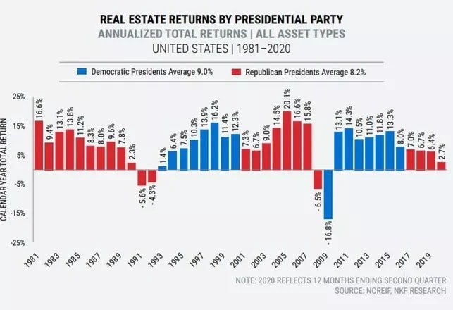 A recent study by Newmark analyzed returns on investment in CRE under the presidential administrations of the last 40 years and found little difference, but what edge there is goes to Democratic presidents. Since the beginning of the Reagan administration in 1981, the report notes, annualized total CRE returns for all asset classes have averaged 9% during the years when a Democratic president was in office (16 years) and 8.2% when a Republican was in office (24 years).